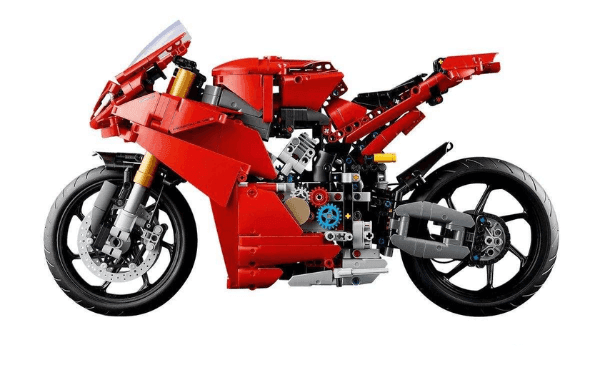Model przedstawia szczegółowo odwzorowany motocykl Ducati Panigale V4 S – legendarny sportowy jednoślad w charakterystycznym czerwonym kolorze i nowoczesnej stylistyce. Zestaw oferuje realistyczne funkcje Technic, które oddają ducha prawdziwej maszyny: ruchome zawieszenia, działający układ kierowniczy, trzystopniową skrzynię biegów z biegiem jałowym oraz łańcuch napędowy połączony z silnikiem V4.