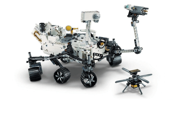 Do zestawu dołączono także miniaturowy model helikoptera Ingenuity, słynnego robota-wiropłata towarzyszącego prawdziwej misji NASA.